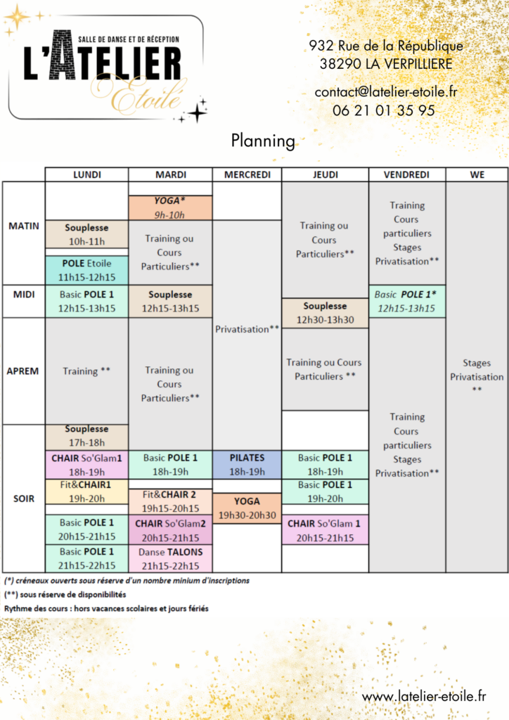 Planning de septembre à juillet, hors vacances scolaires et jours fériés.